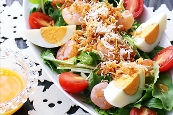- 皿に水菜・ミニトマト・ゆで卵・ベビーリーフ・むきえびを盛り、3をかける仕上げに☆のドレッシングをかける
