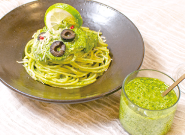 春菊の香りを活かしたジェノベーゼ風ソース。パスタやドレッシングに使える万能レシピ。
