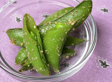 汁気が出ないのでお弁当にも最適。スナップえんどうの食感が楽しい胡麻和えです。