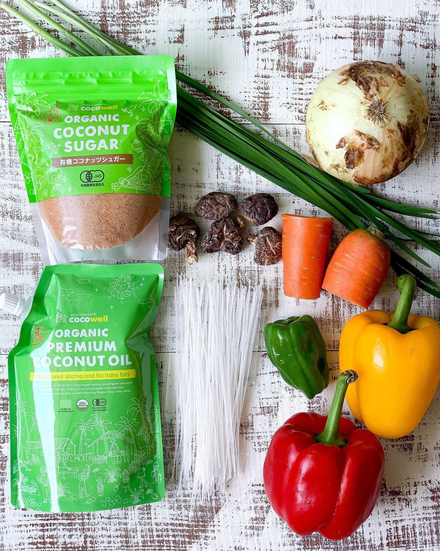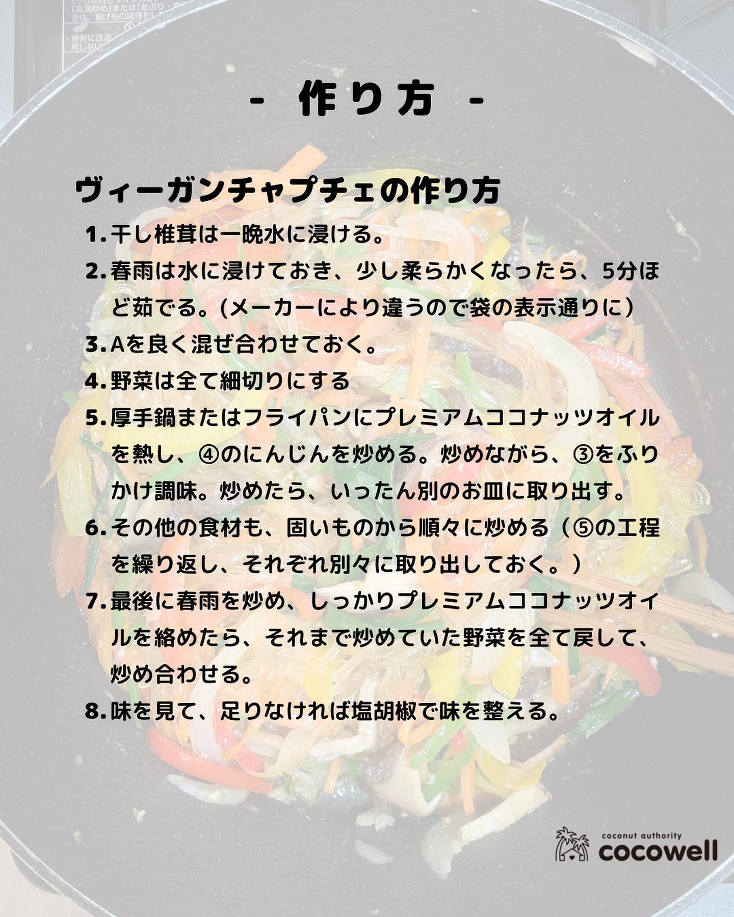 (⑤の工程を繰り返し、それぞれ別々に取り出しておく。) - 最後に春雨を炒め、しっかりプレミアムココナッツオイルを絡めたら、それまで炒めていた野菜を全て戻して、炒め合わせる。
