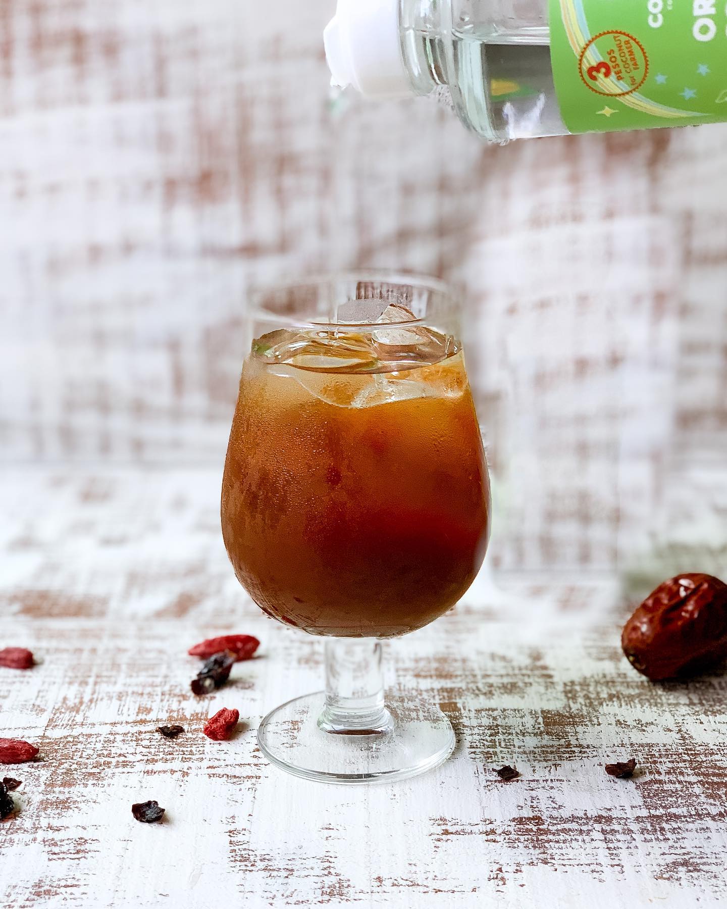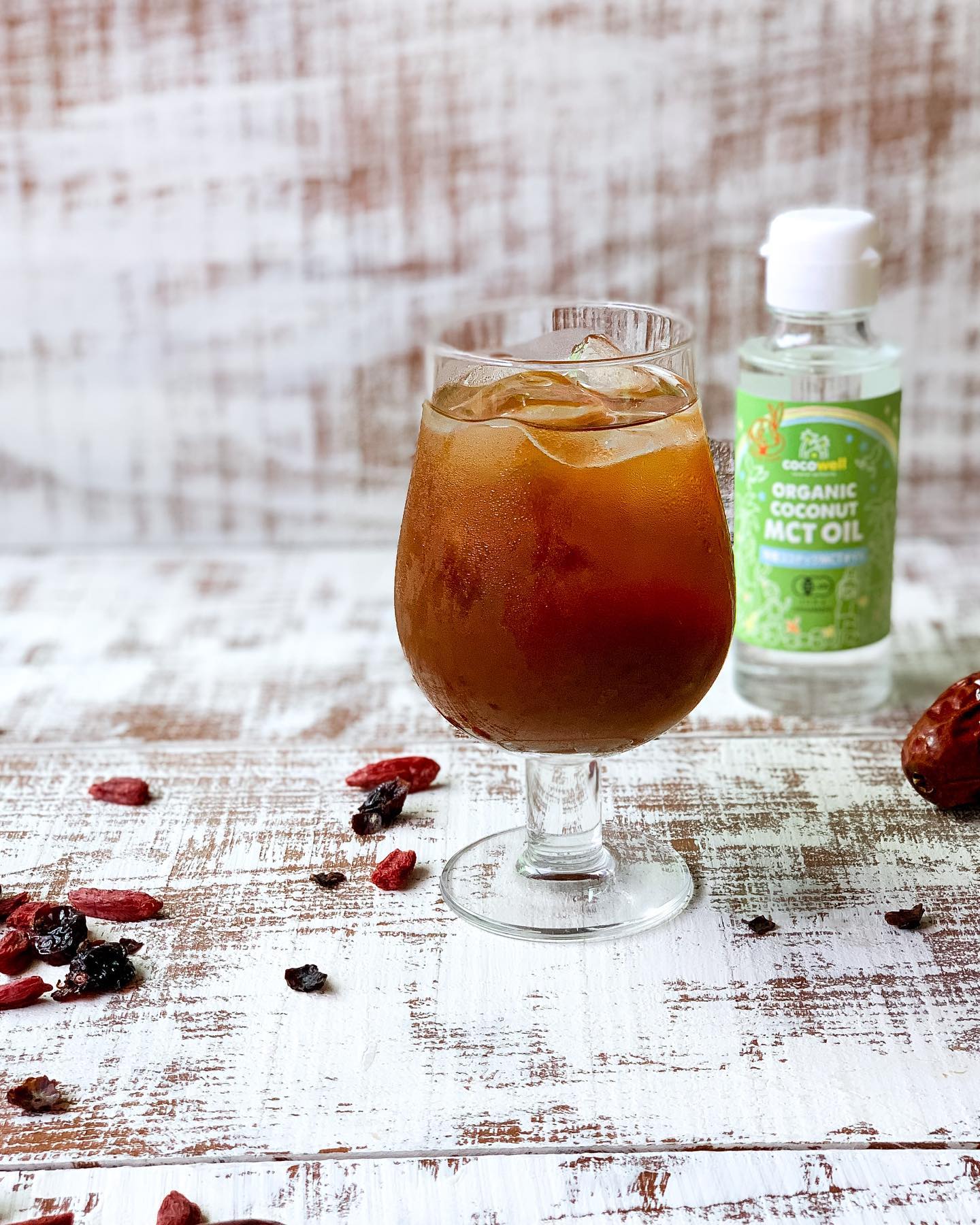 ローズヒップの華やかな酸味とMCTオイルのまろやかさが楽しめる、手作りデトックスアイスティー。