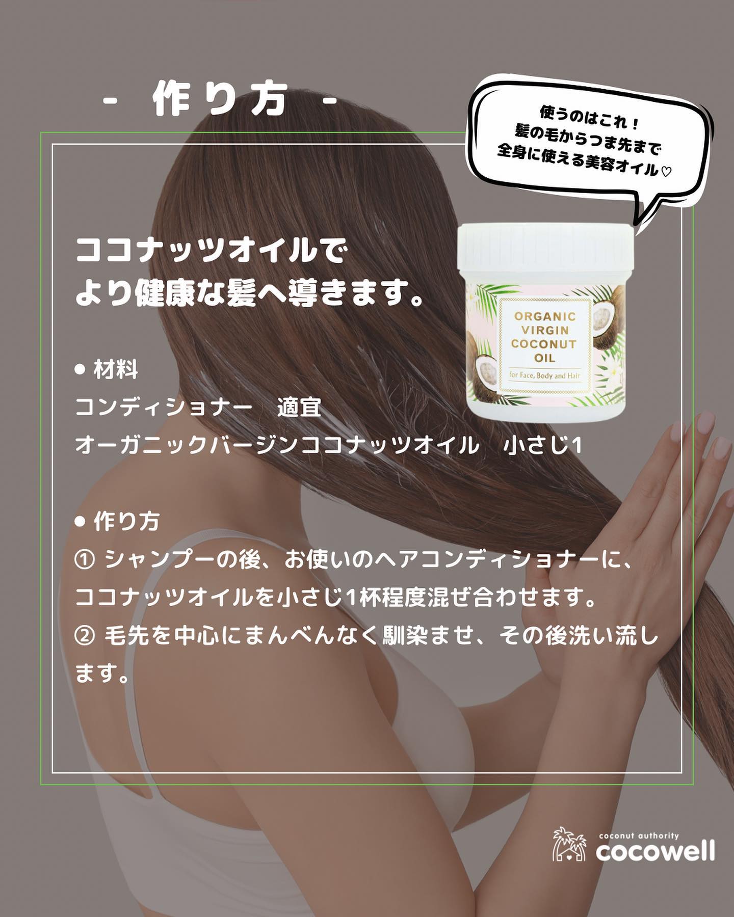 ・使用するのはオーガニックバージンココナッツオイルがベスト。髪や頭皮にやさしく、安心して使えます。