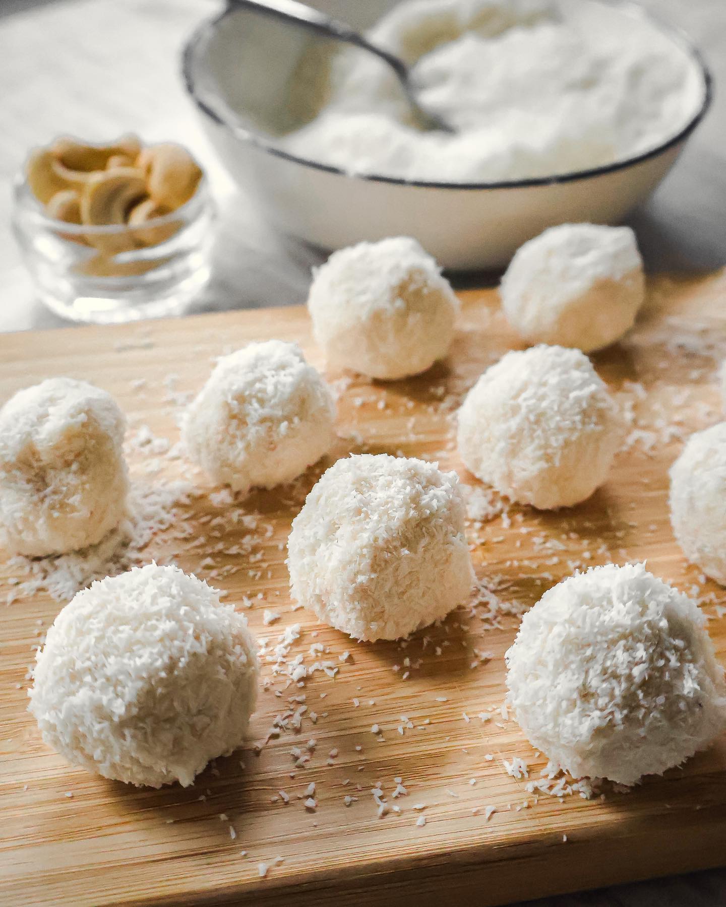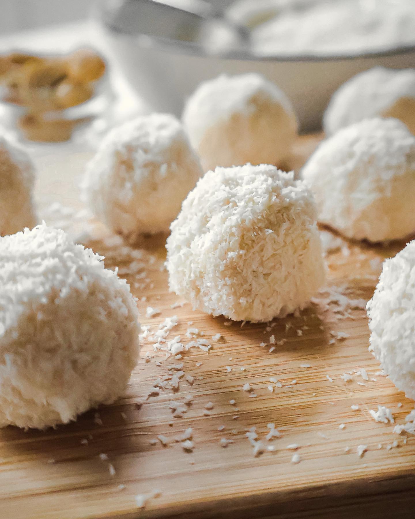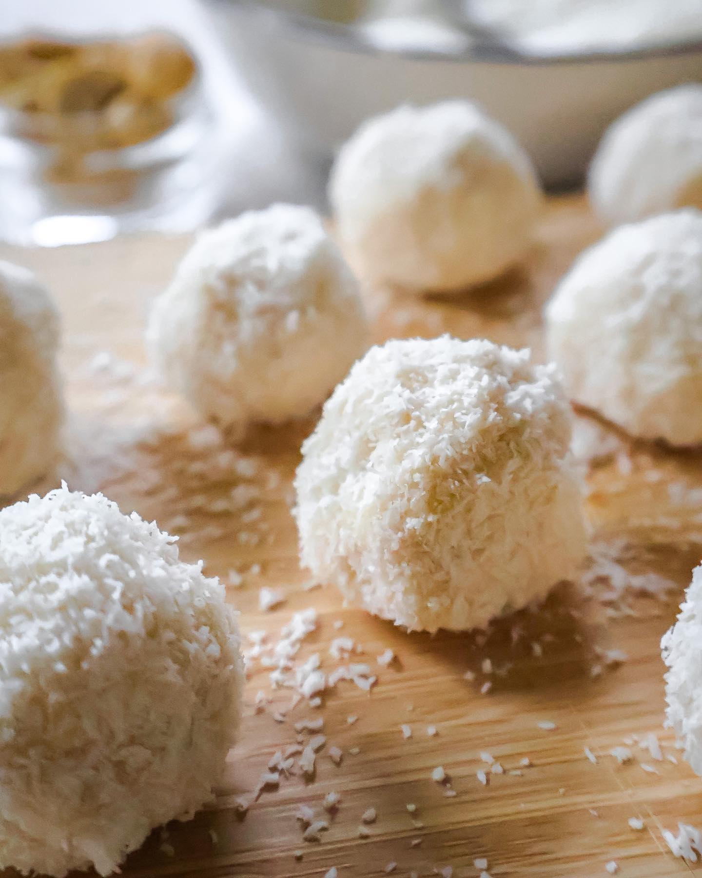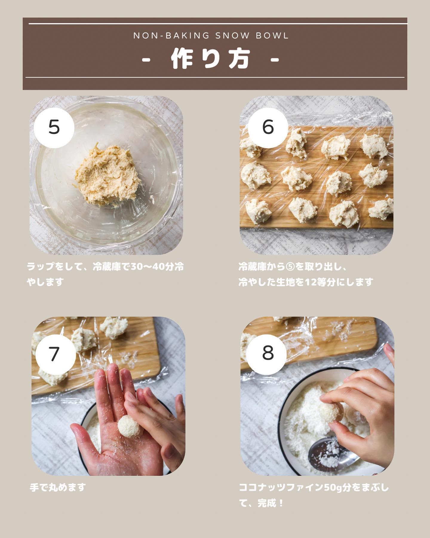 ・仕上げにココナッツファインをまぶすと、見た目も可愛い“雪のような”スノーボールに。