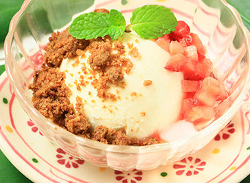- 器に3・バニラアイス・4を盛りミントを添える食べる直前にオイルをアイスにかける