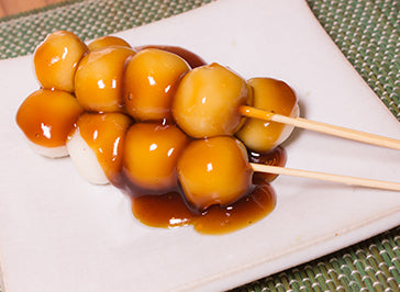 - 水溶き片栗粉でとろみをつけ団子を串に刺してたれをかける