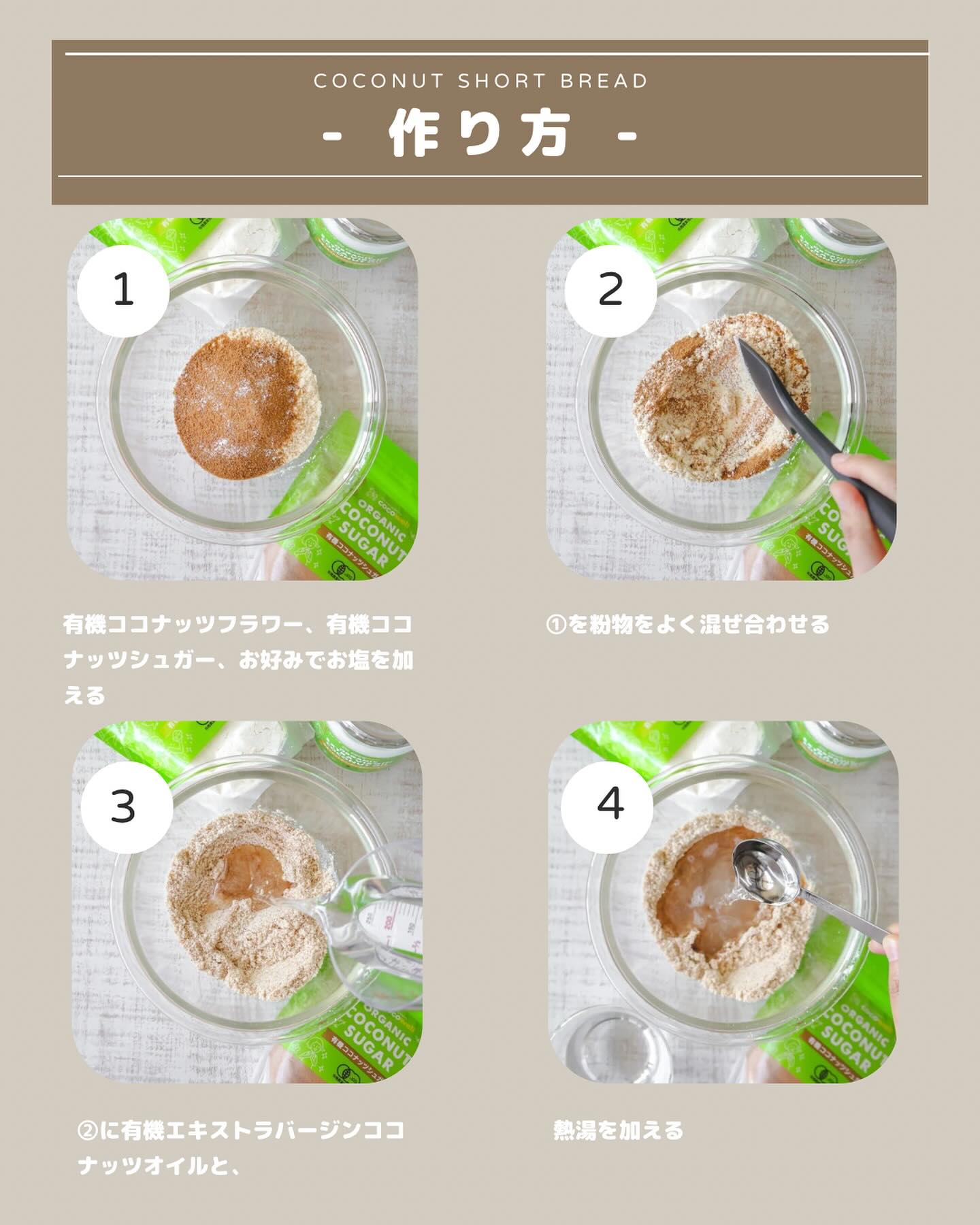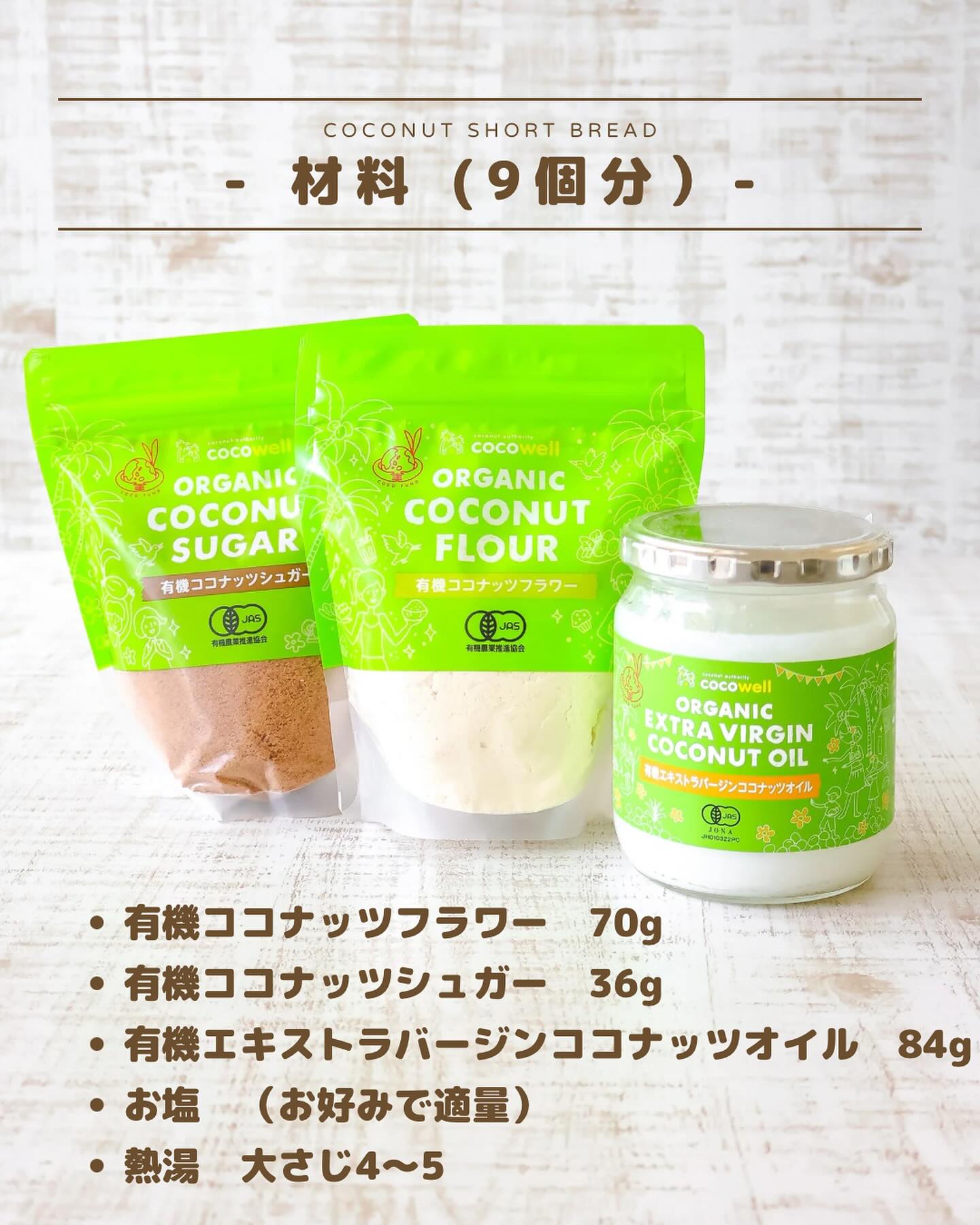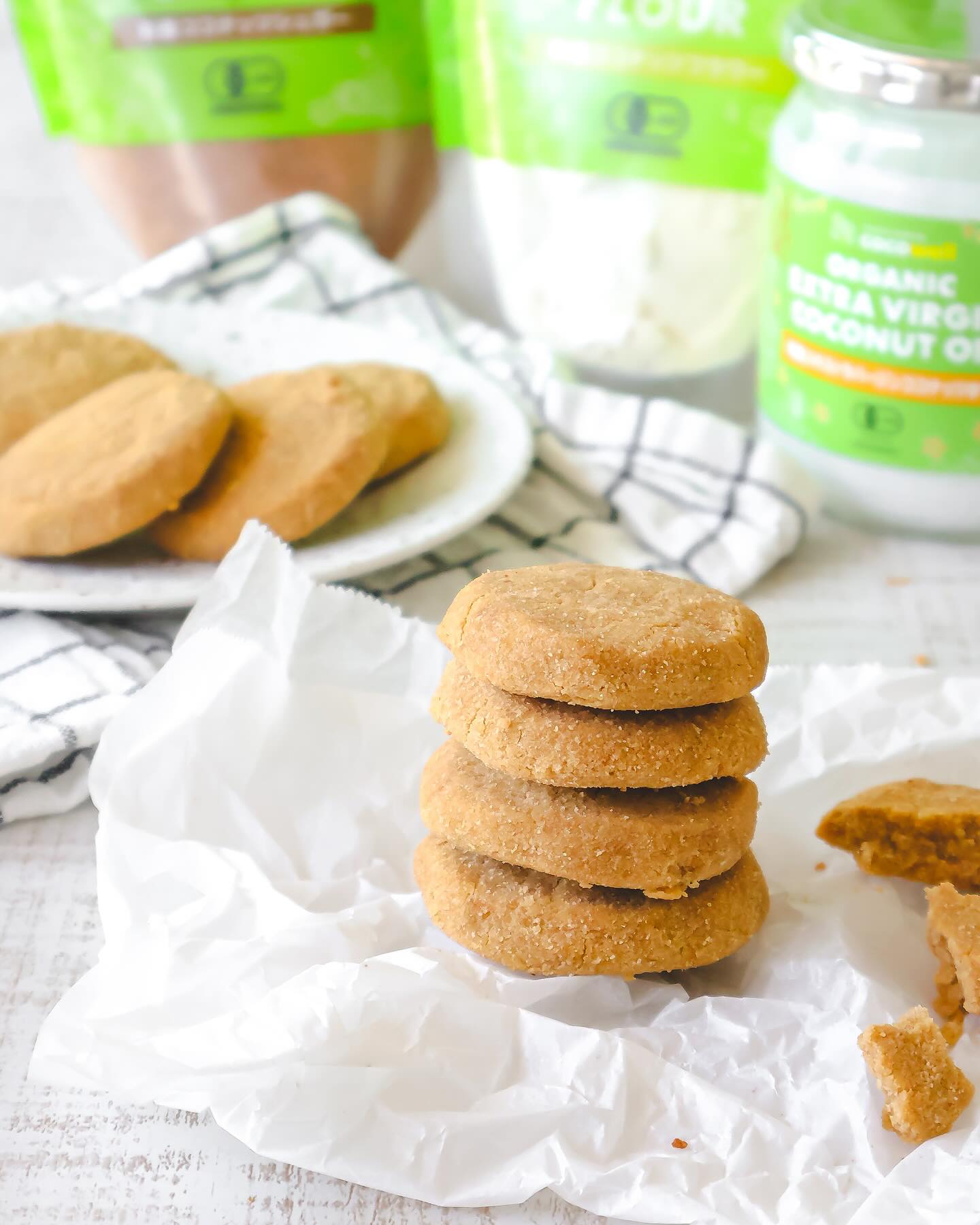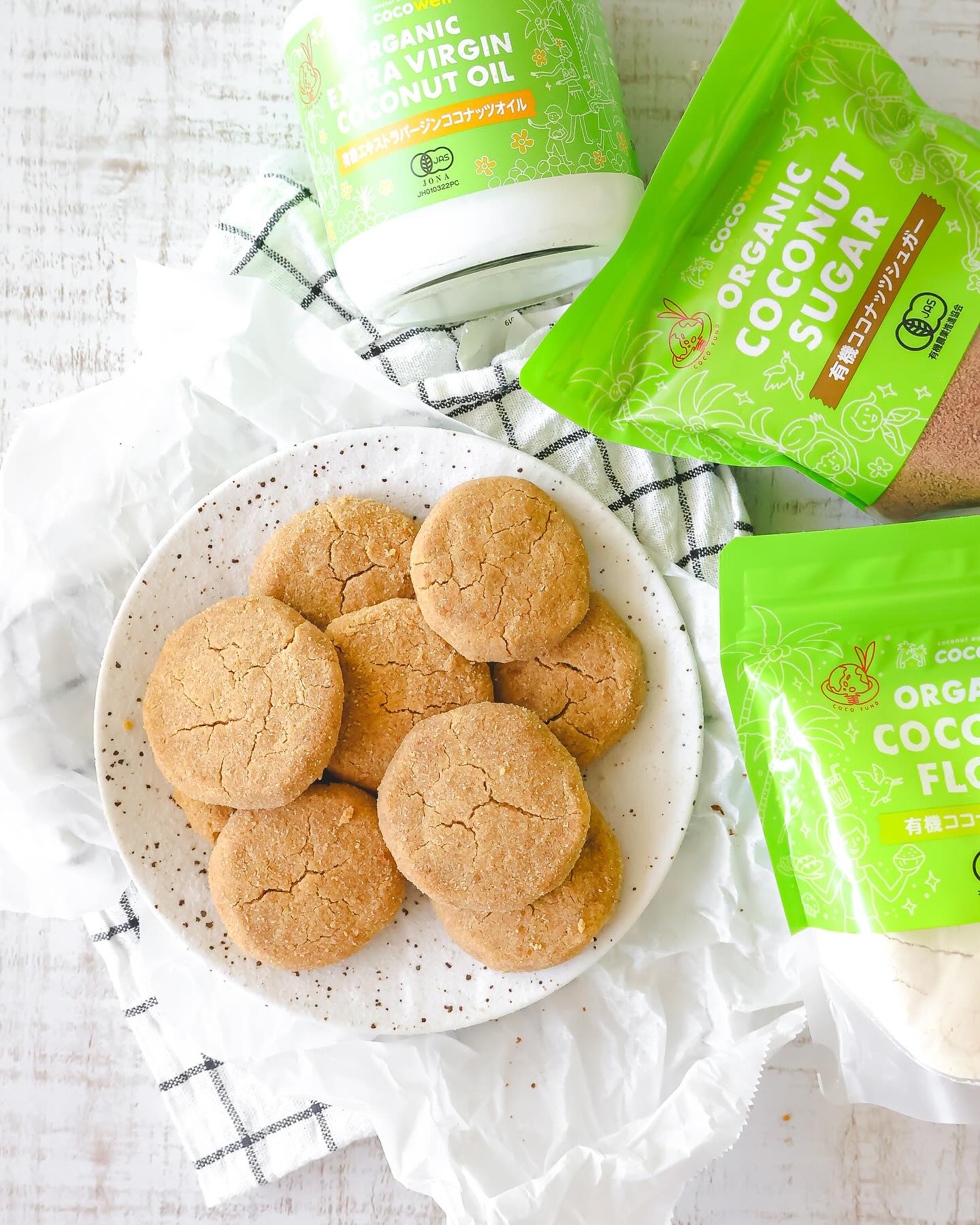 ココナッツフラワーとココナッツオイル、ココナッツシュガーだけで作れ、グルテンフリー&ヴィーガン対応。