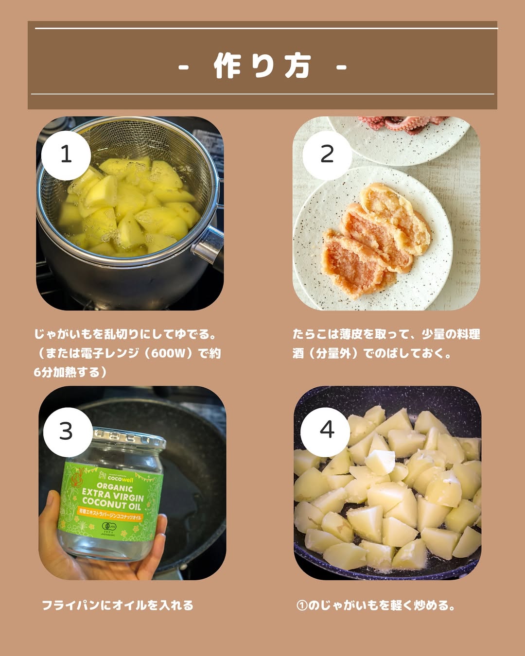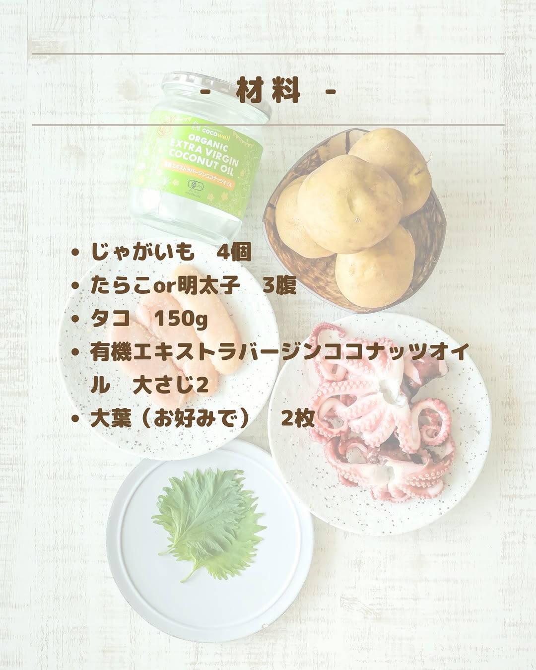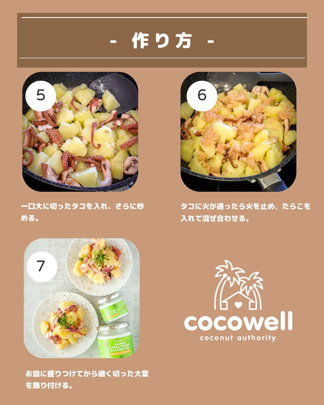タコ・じゃがいも・たらこをココナッツオイルで香ばしく仕上げる、旨みたっぷりの簡単ソテー。