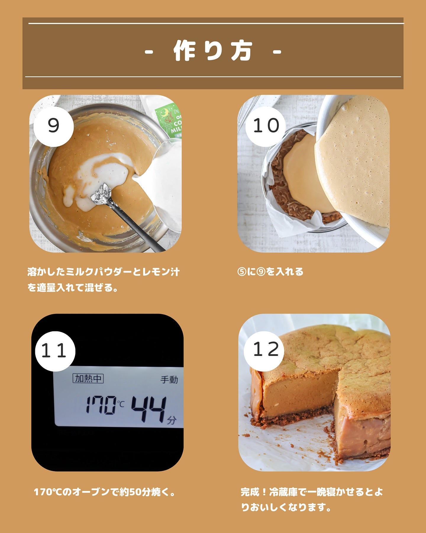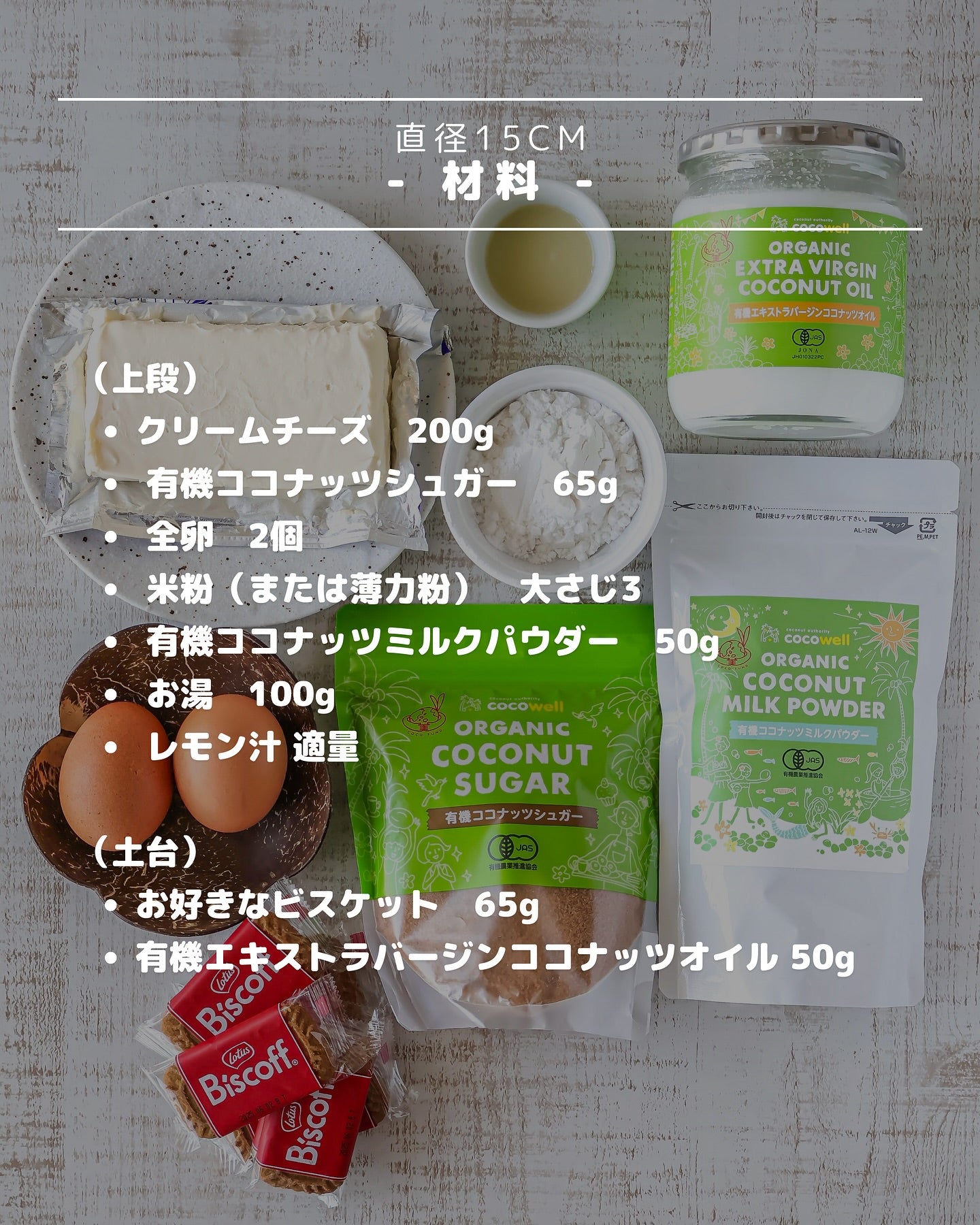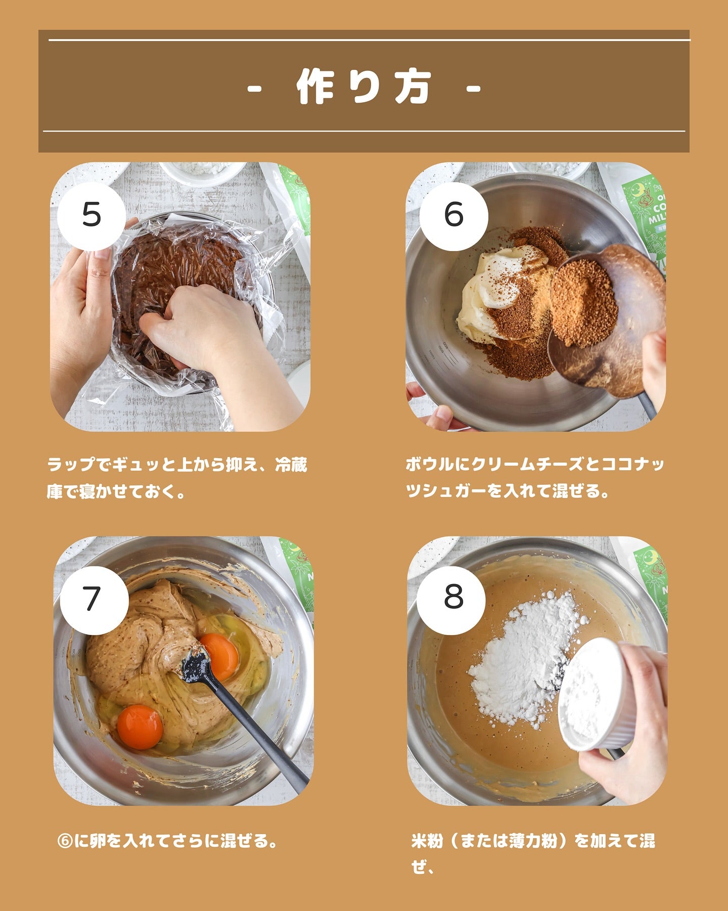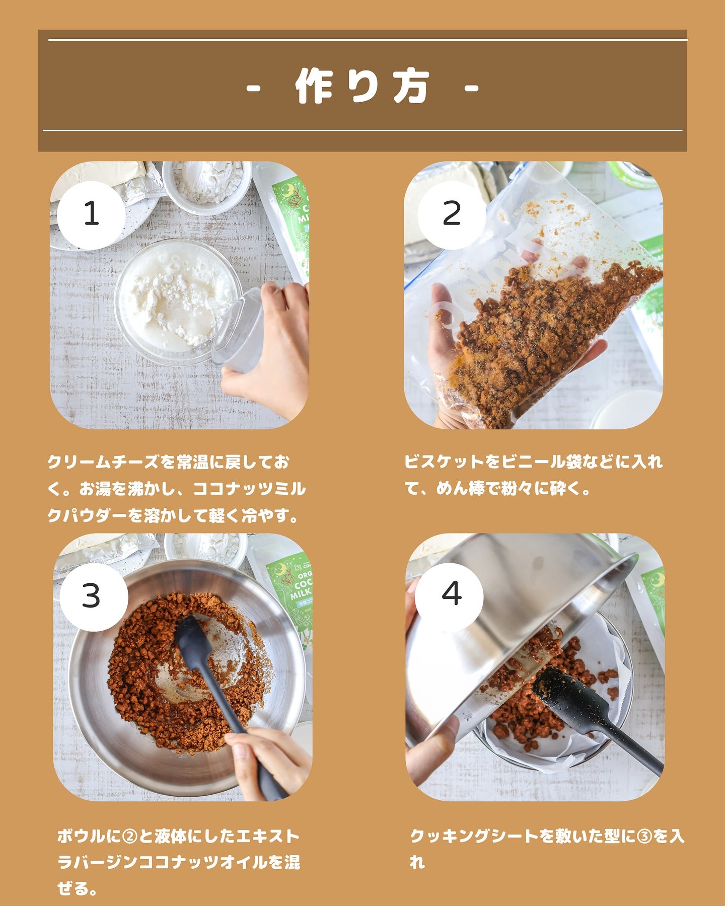 クリームチーズにココナッツミルクパウダーとココナッツシュガーを合わせることで、優しい甘さとコクが生まれ、ほんのりキャラメル色のリッチな仕上がりに。