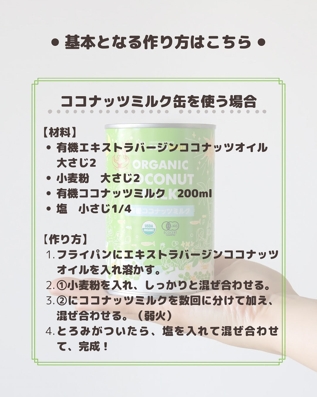 ココナッツの自然な甘みとまろやかさが加わることで、優しい味わいのホワイトソースに仕上がります。