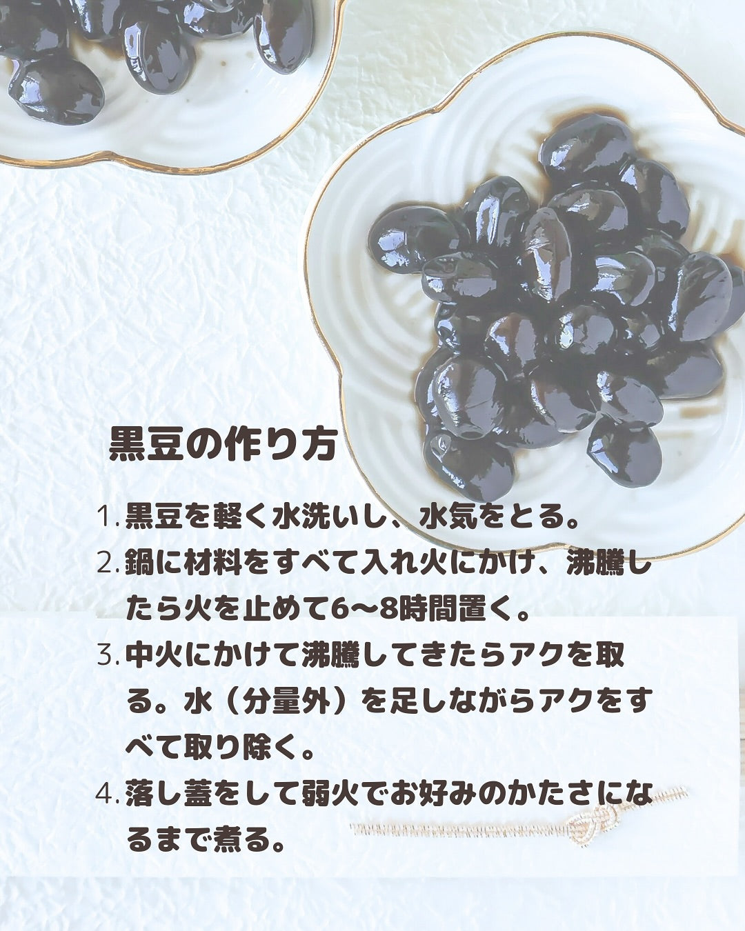 ・アクを丁寧に取り除くことで、黒豆の黒さが際立ち、仕上がりが上品に。