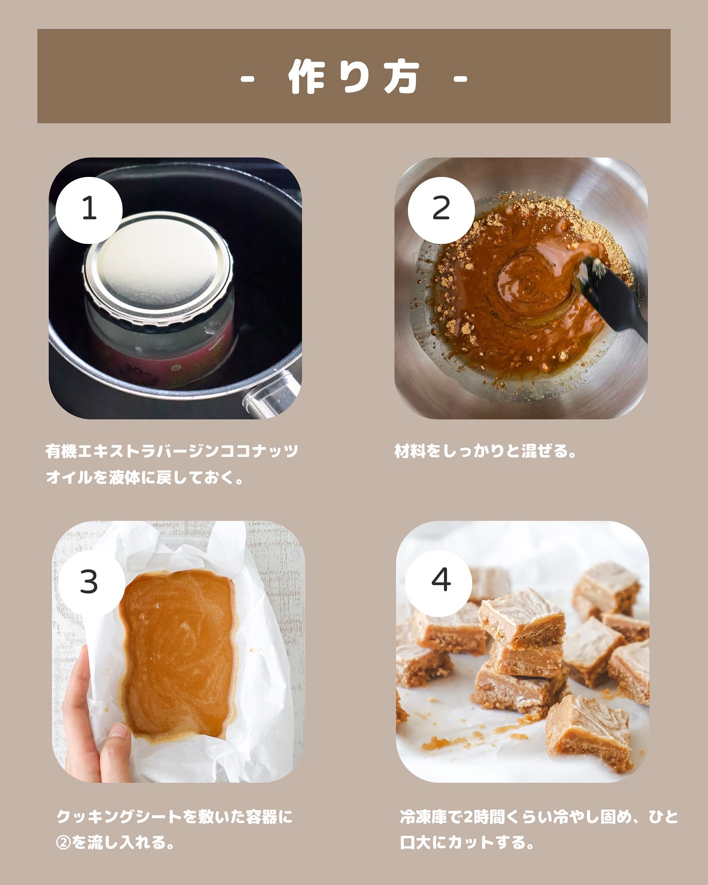 ココナッツオイルのまろやかさときなこの香ばしさが相性抜群で、混ぜて冷やすだけで作れるお手軽スイーツです。