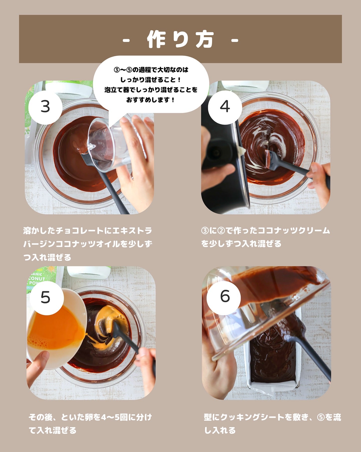 ・チョコ・ココナッツオイル・ココナッツクリームは“少しずつ混ぜる”ことで分離を防ぎ、なめらかな生地に。