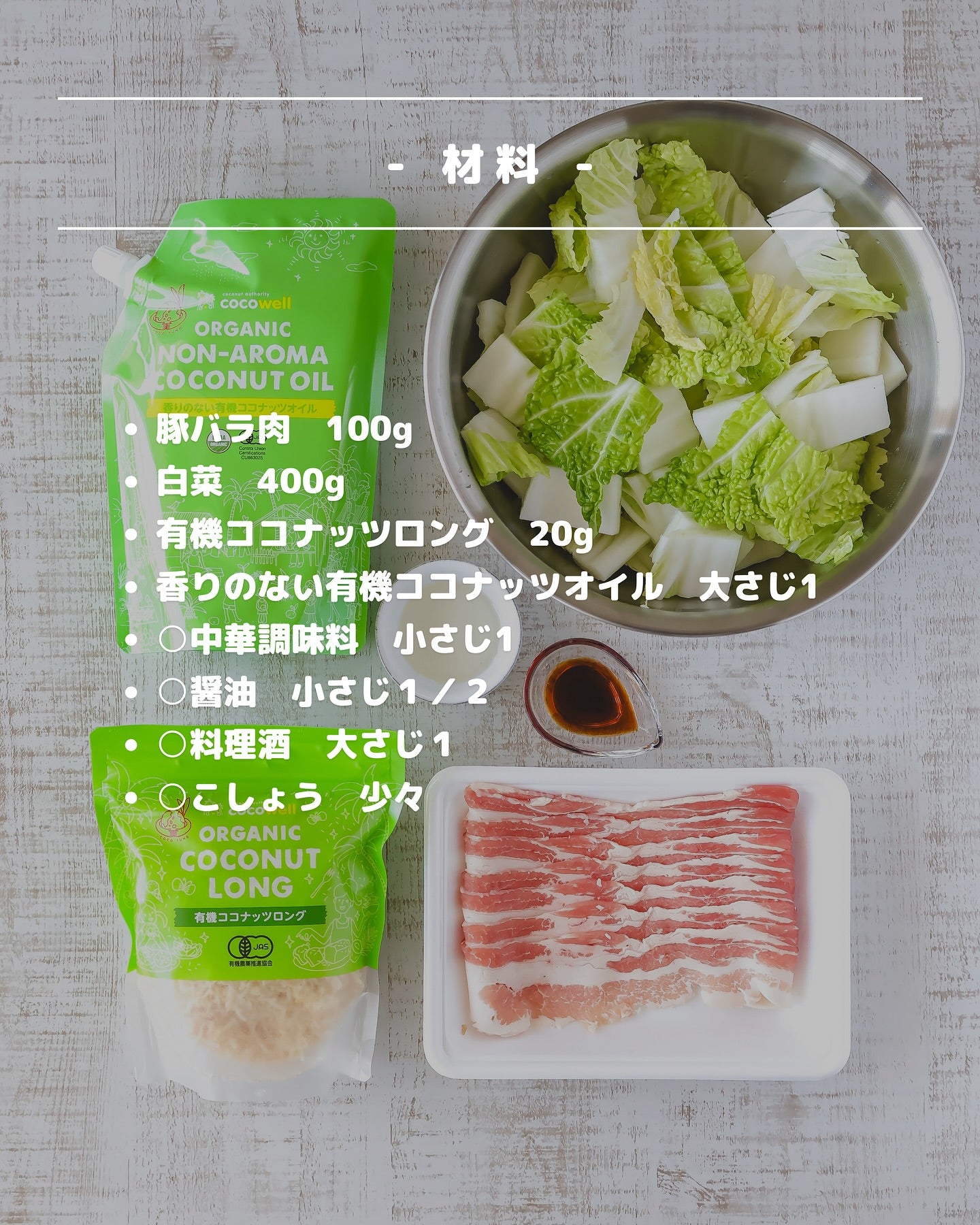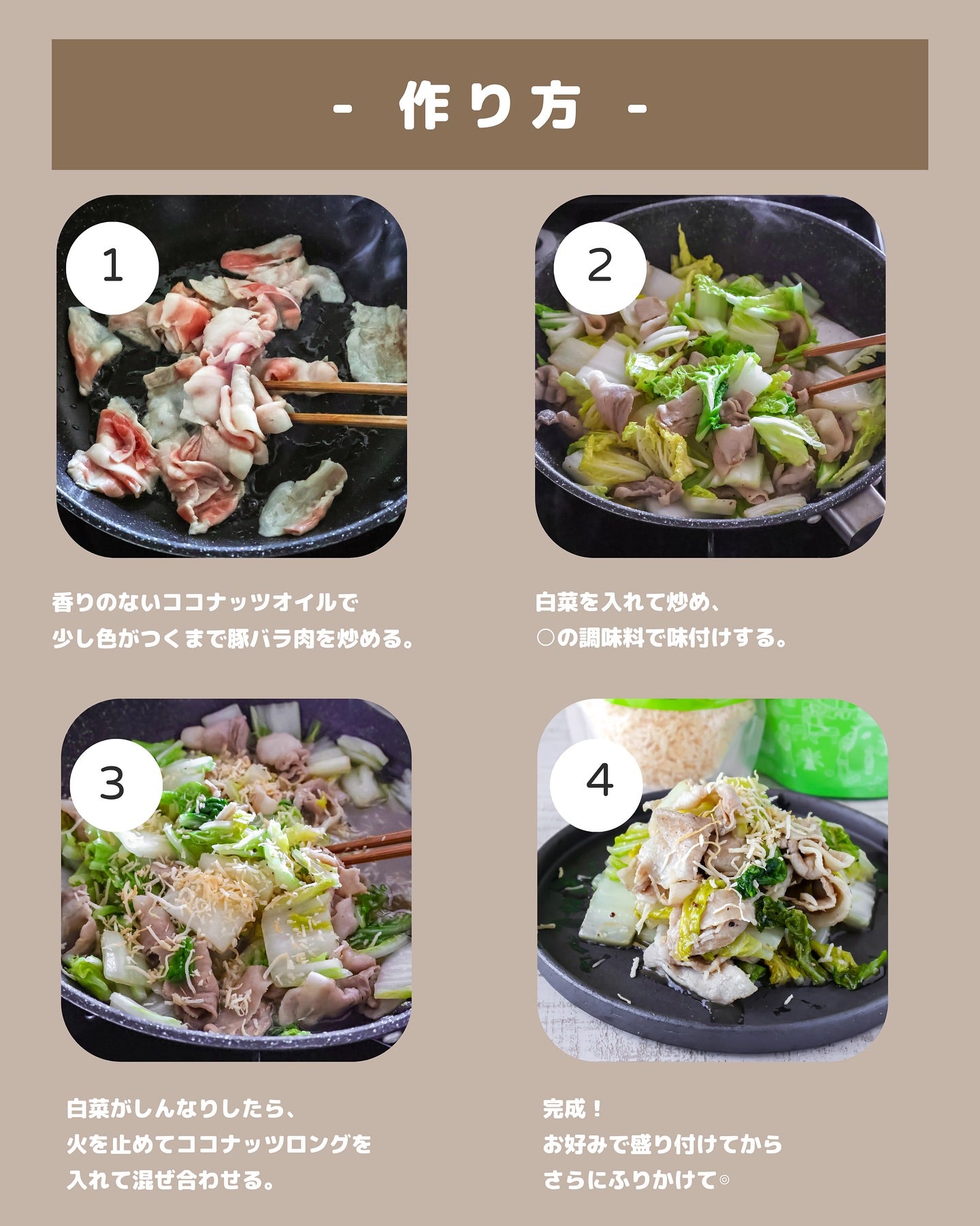 旬の白菜に豚バラの旨み、さらにココナッツロングの香ばしさをプラスした、意外な組み合わせの炒めものレシピです。