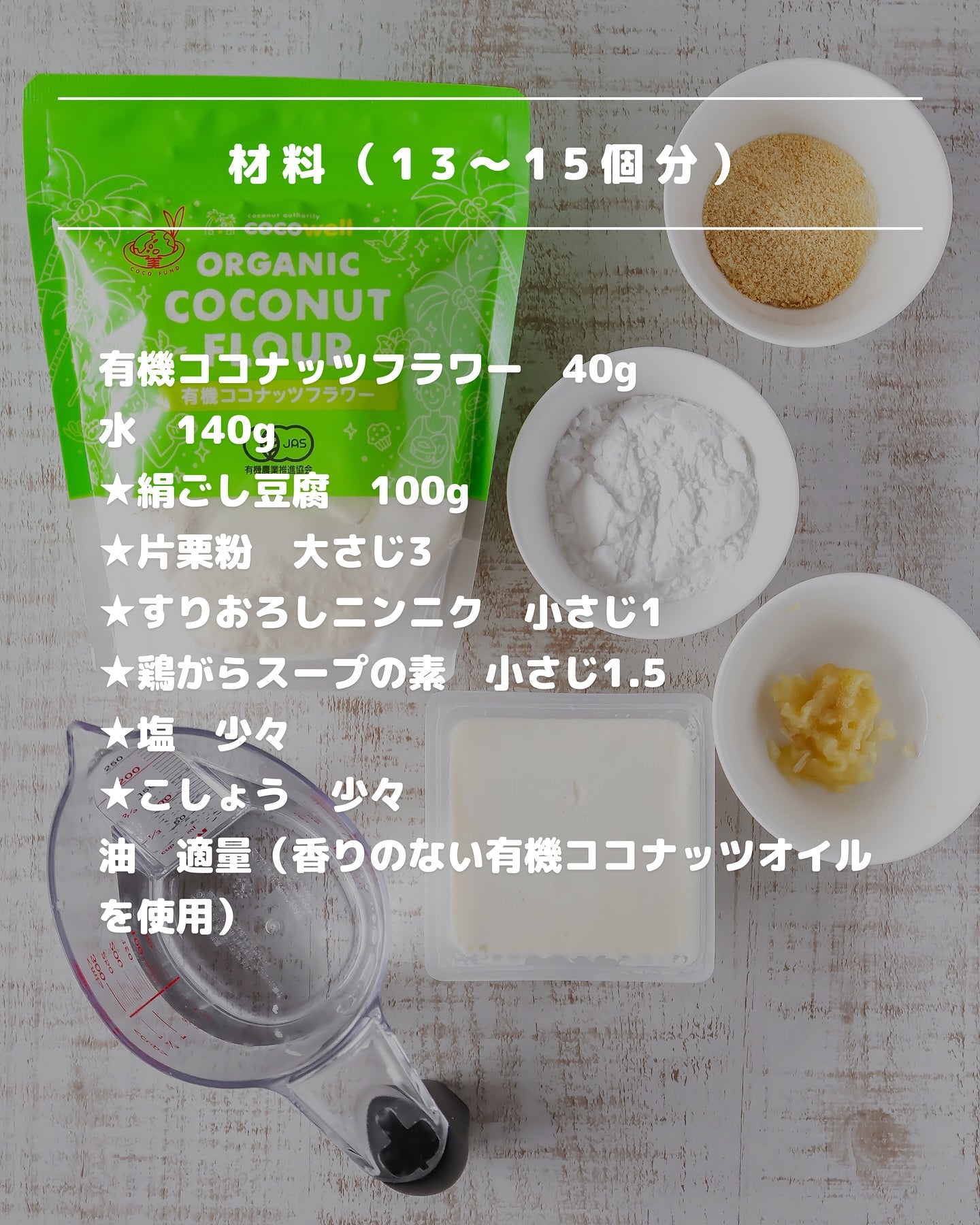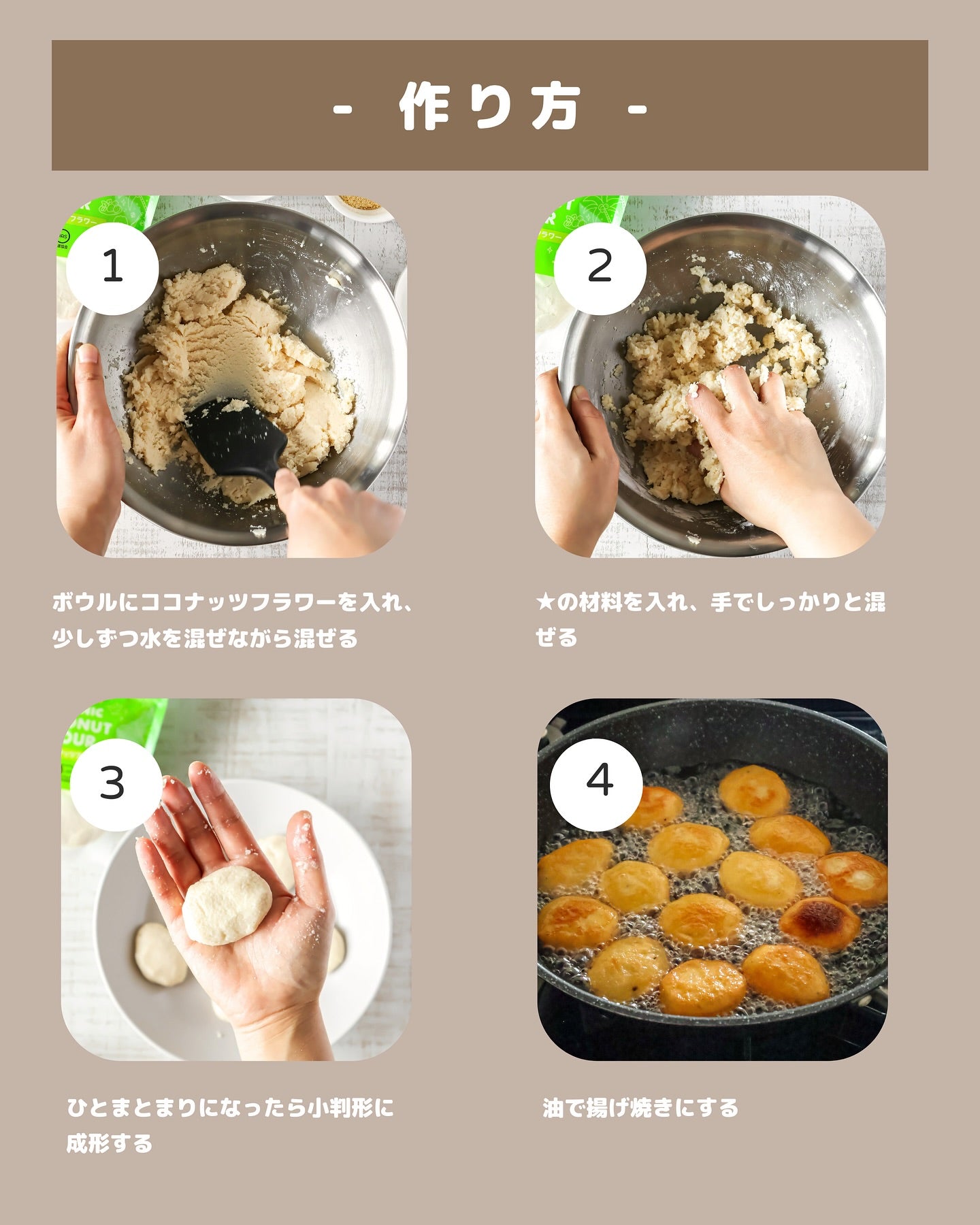 ・ココナッツフラワーは吸水が早いので、水は必ず少しずつ加えて調整すると扱いやすい。
