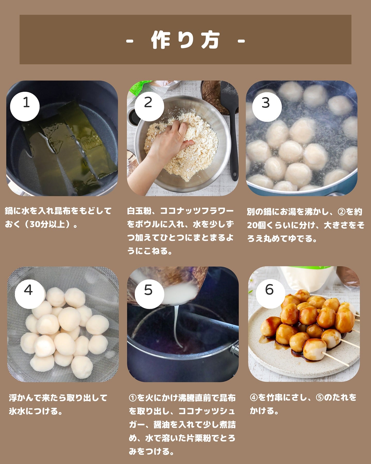 タレにはココナッツシュガーを使っているので、やさしい甘さとコクが感じられる和スイーツに仕上がります。