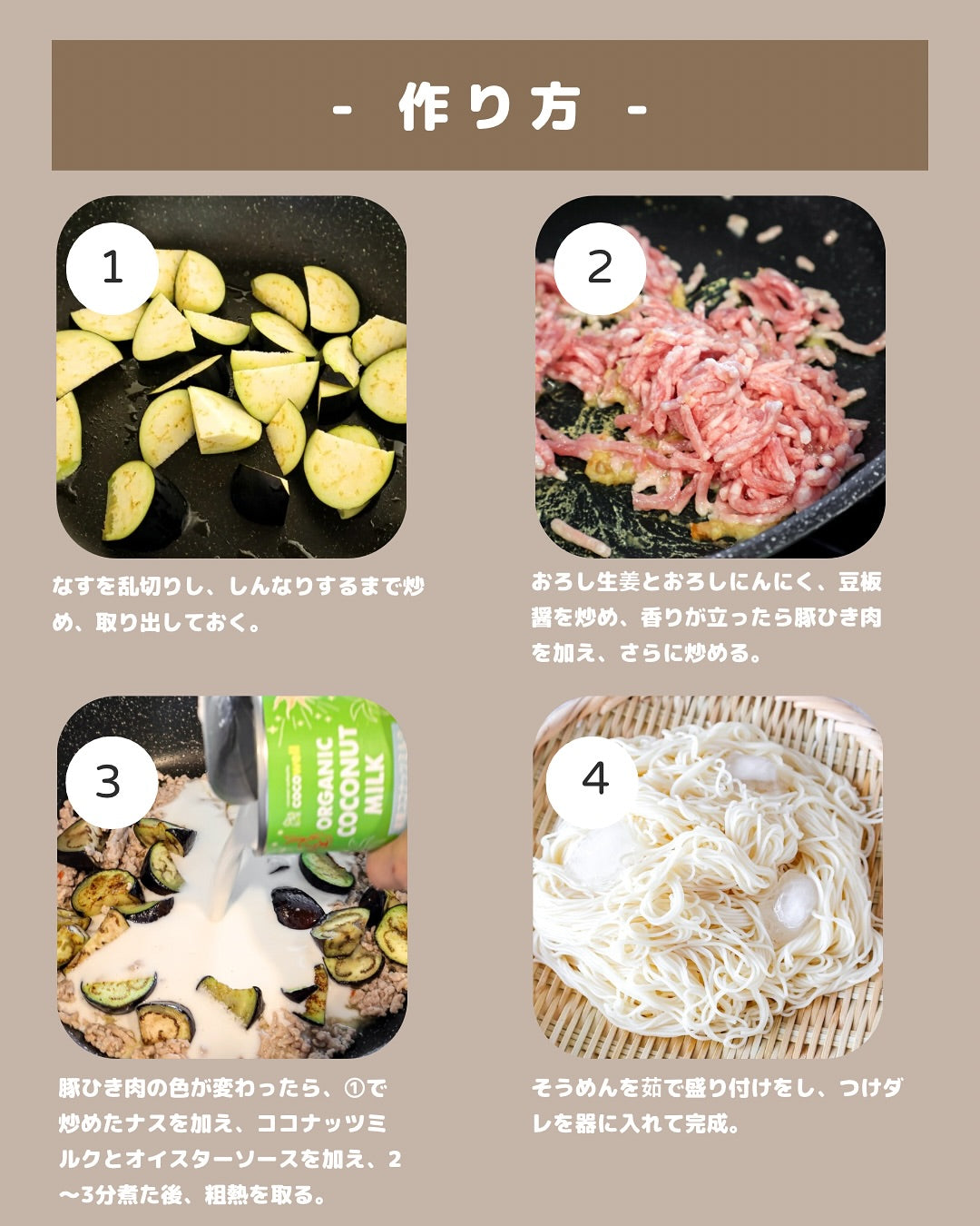 - 豚ひき肉の色が変わったら、1)で炒めたナスを加え、ココナッツミルクとオイスターソースを加え、2~3分煮た後、粗熱を取る。