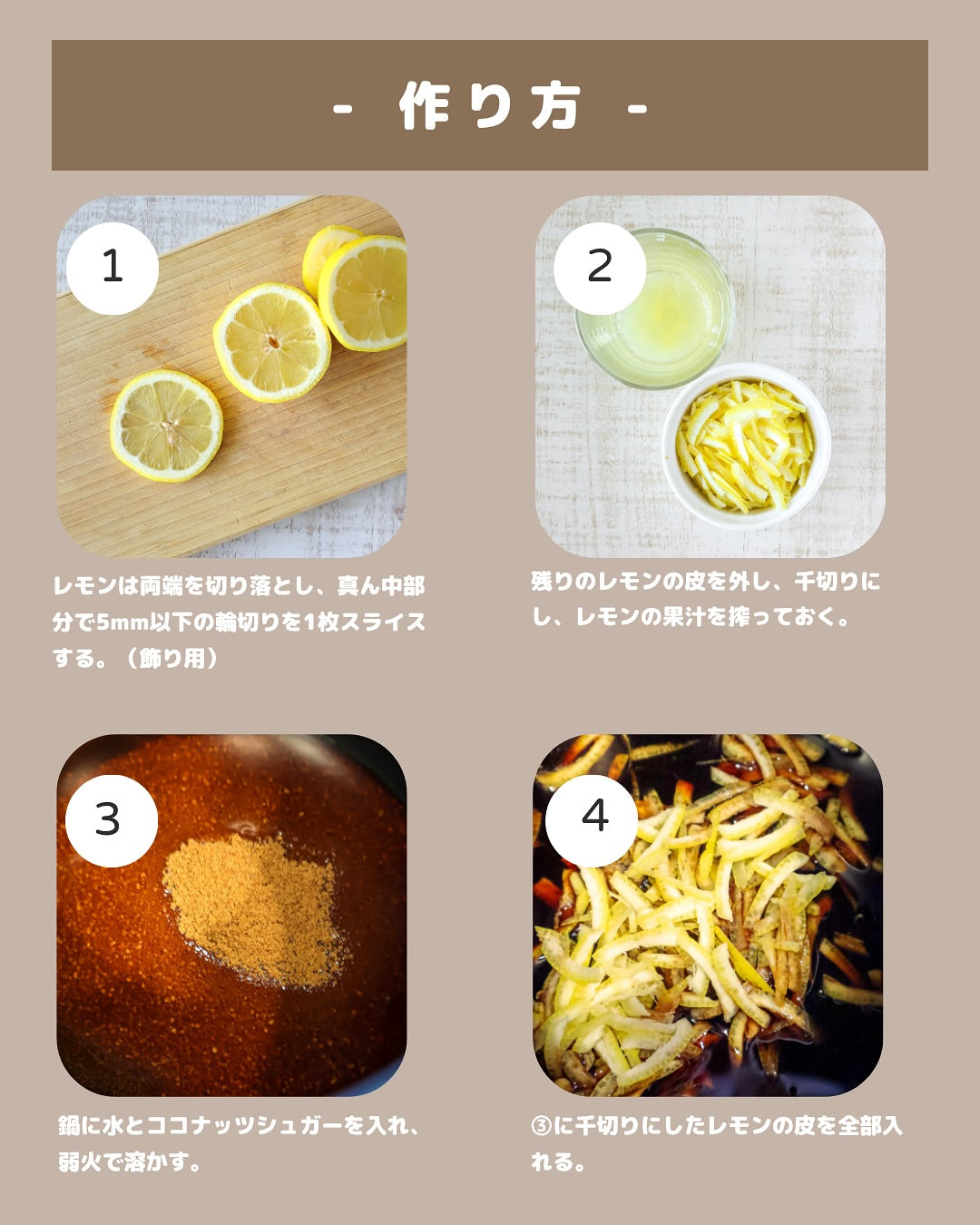 ・レモンの皮は白い部分を取りすぎると苦味が出るので薄めにむくのがコツ。