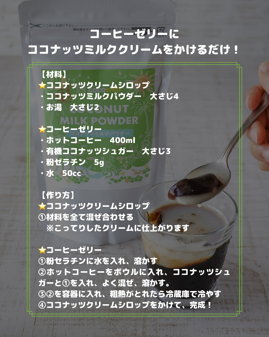 ココナッツミルクパウダーで作る濃厚ココナッツクリームシロップが、 ほろ苦いコーヒーゼリーに自然なコクと甘さをプラスしてくれます。