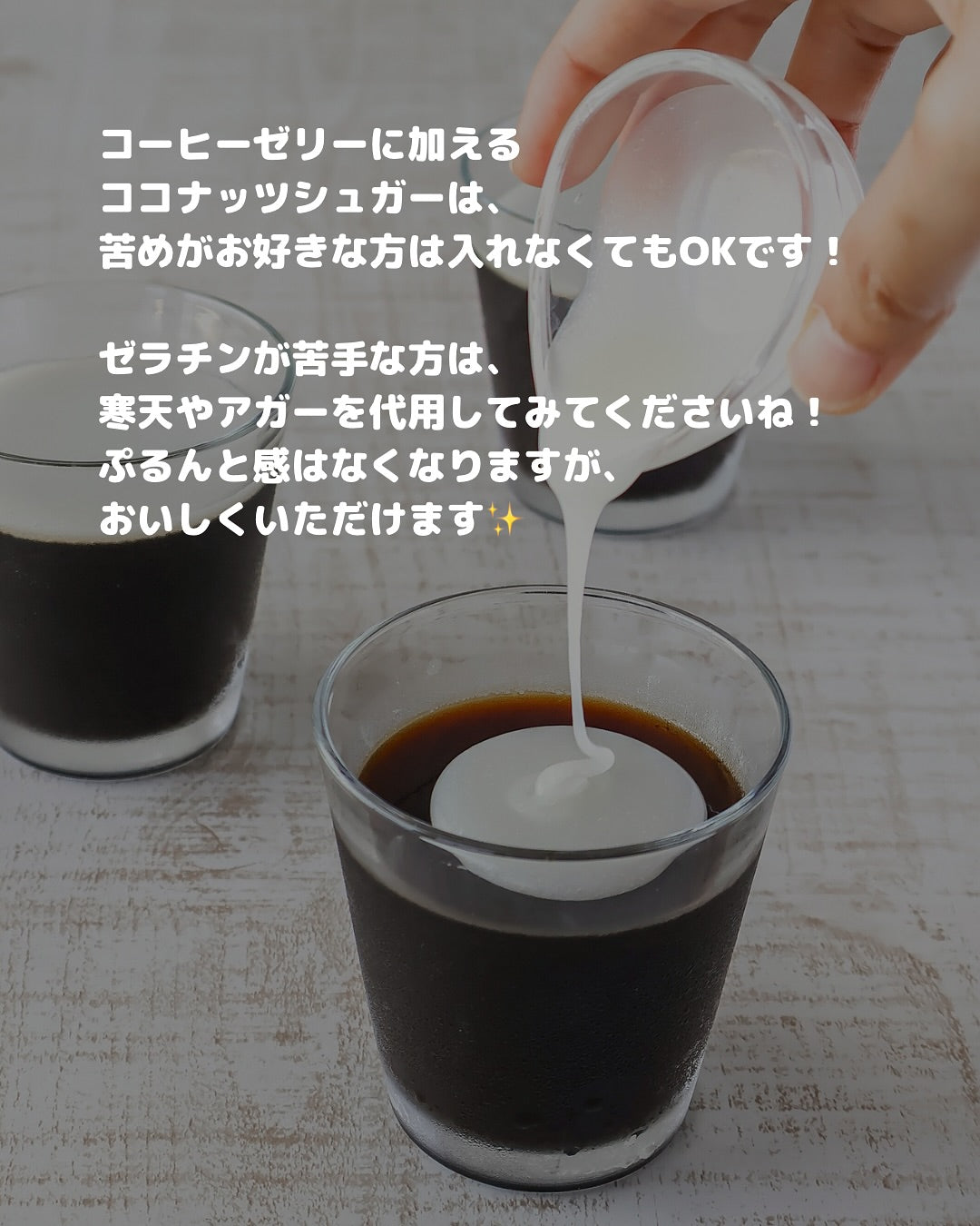 ・苦めが好きな方は、ゼリー側のココナッツシュガーを減らす or なしでOK。
