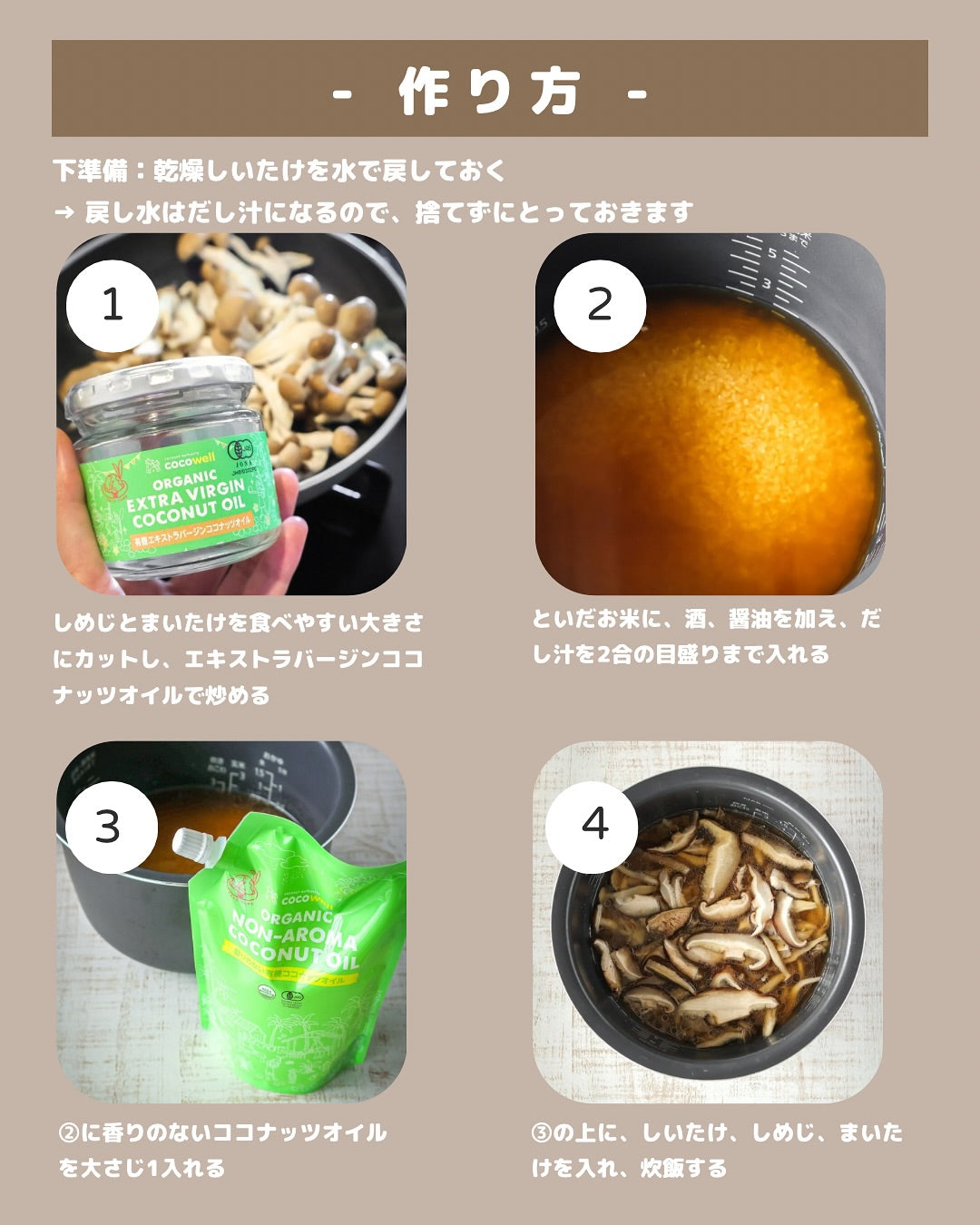 ポイントはきのこをエキストラバージンココナッツオイルで一度炒めてから炊くこと。