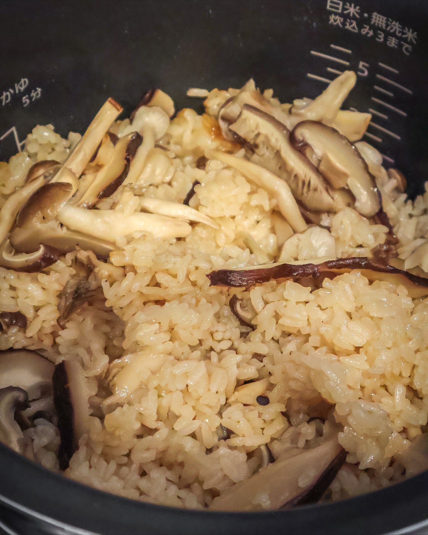- ④の上に、しいたけ、しめじ、まいたけを入れ、炊飯する
