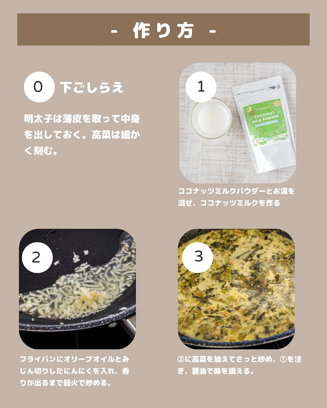 明太子は薄皮を取って中身を出しておく。高菜は細かく刻む。 - ココナッツミルクパウダーとお湯を混ぜ、ココナッツミルクを作る