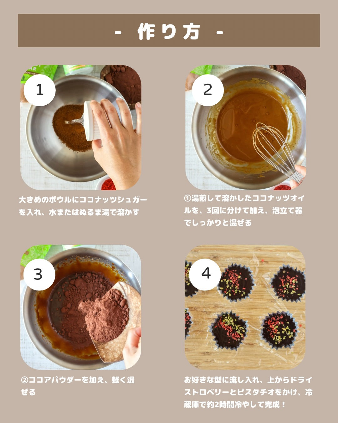 ココナッツオイルで作るこちらのチョコレートは、ヴィーガン&グルテンフリー。火を使わず、混ぜて冷やすだけなので、お子さまと一緒に安心して楽しめます🍫