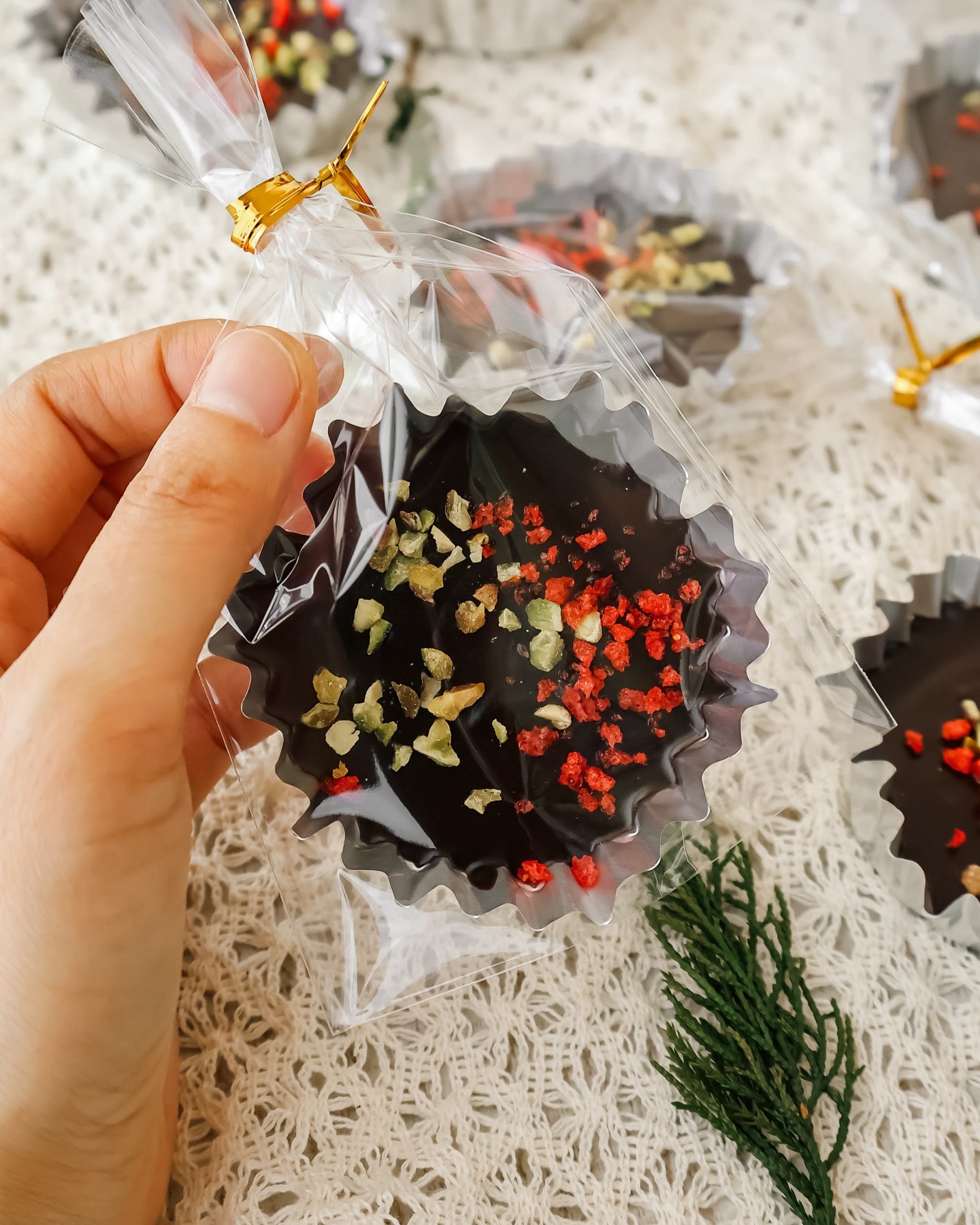 ドライストロベリーやピスタチオをトッピングすれば、見た目もぐっとクリスマスらしく華やかに。型やトッピングを変えるだけで、オリジナルのチョコレートが完成します。
