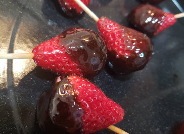 - 鍋底を水で冷やし試し串に飴が付く状態になったらフルーツに絡める固まりやすいので手早く